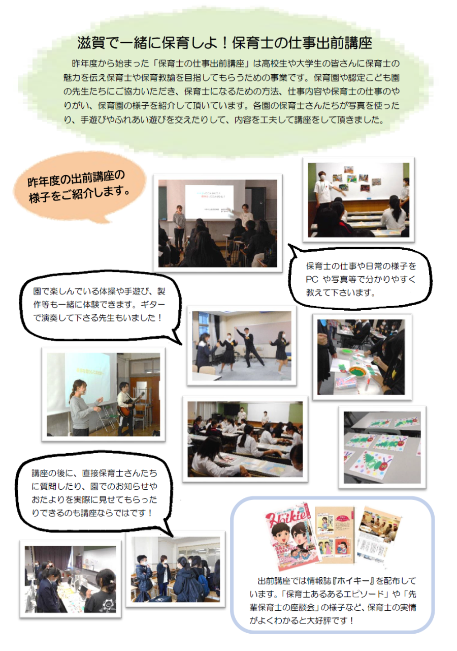 2020年度出前講座の様子 2021年4月20日 ~滋賀で一緒に保育しよ!~ 保育士の仕事出前講座を行いました。 県内高等学校や滋賀・京都の保育士養成校に、保育職場の魅力や就職を目指してもらうことを目的に、現職の保育士が保育の仕事の魅力を伝えました。
