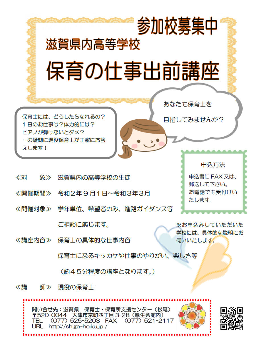 2020年度出前講座のご案内 2020年6月11日 保育の仕事出前講座を行います。 県内高等学校や滋賀、京都の保育士養成校に、保育現場の魅力や就職を目指してもらうことを目的に現職の保育士が保育の仕事の魅力を伝えます。 高等学校へのご案内 案内文・申込書はこちら 案内文[635.3KB] 申込書[PDF:93.8KB] 養成校へのご案内 案内文、申込書はこちら 案内文[PDF:108.8KB] 申込書[PDF:94.0KB]