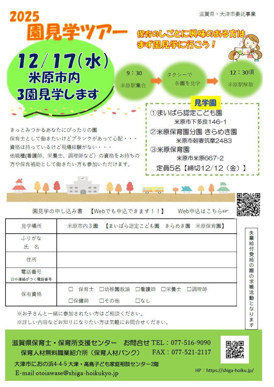 再就職支援研修・保育補助者研修のお知らせ~IN彦根 11月19日(水) 11月25日(火)