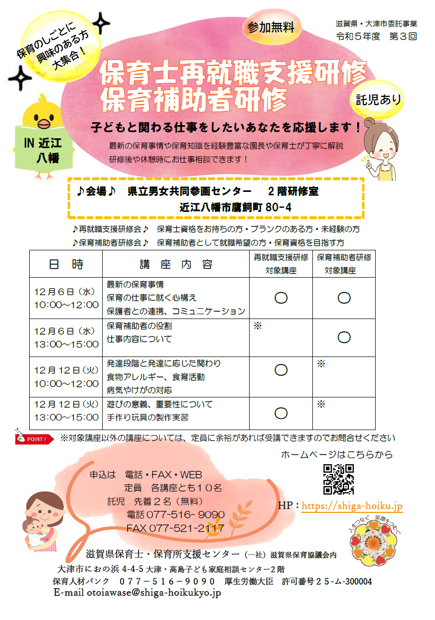 再就職支援研修・保育補助者研修のお知らせ~IN近江八幡~12月6日(水)・12月12日(火)