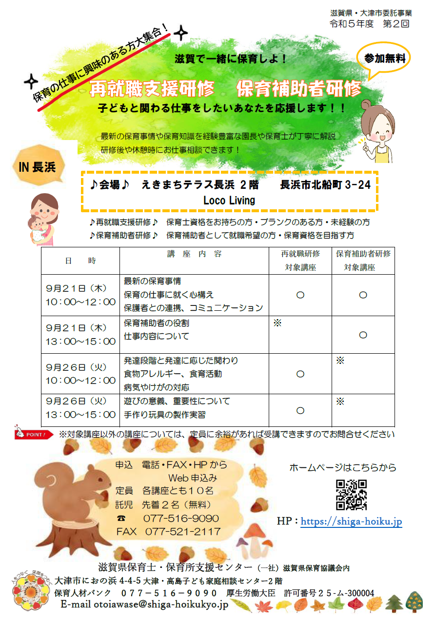 再就職支援研修・保育補助者研修のお知らせ~IN長浜~9月21日(木)・9月26日(火)