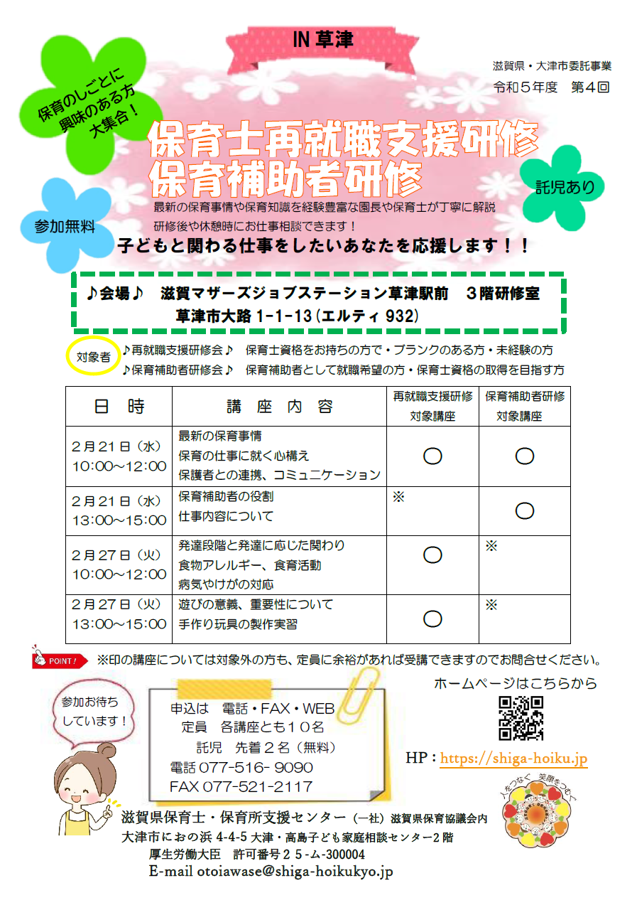 再就職支援研修・保育補助者研修のお知らせ~IN草津~2月21日(水)2月27日(火)