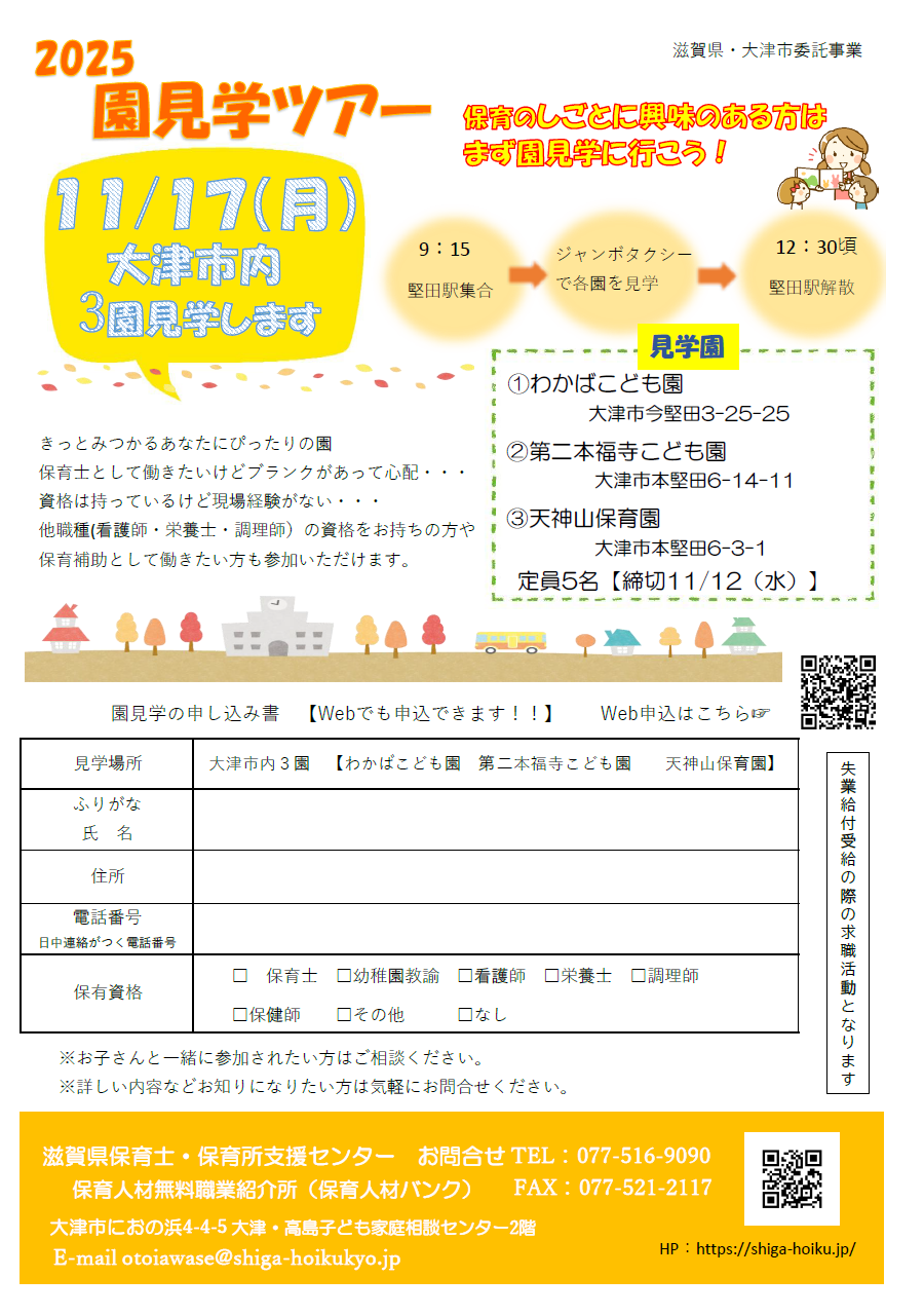 保育に関わるお仕事をお探しの方保育士を目指している方 ☆★園見学会のお知らせ【大津市内3園】★ 2025年9月26日 ☆★園見学会のお知らせ★☆ ✨参加無料❣ ✨ジャンボタクシーで各園を見学します! 半日で、まとめて3園見学できます。 この機会に見学ください。 11月17日(月)大津市内 堅田駅集合 9:15 ※帰りは12:30頃を予定しています。 ①わかばこども園 ②第二本福寺こども園 ③天神山保育園 定員:5名 締切 11/12(水) 申し込みは下記にあります!!Webでも申込できます(^^)/