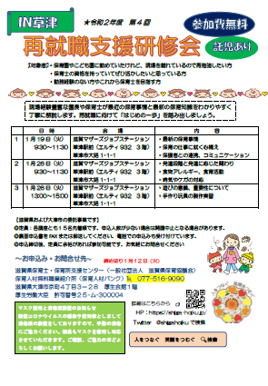 保育に関わるお仕事をお探しの方保育士を目指している方 再就職支援研修開催のお知らせ ~IN草津~1月開催 2020年12月4日 再就職支援研修のお知らせ IN草津 1月開催 ★参加無料 ★託児あり 現場を離れているので、再勉強したい方、保育士の資格を持っていてぜひ活かしたいと思っている方。 ~再就職に向けて「はじめの一歩」を踏み出しましょう~ 🌸申し込み・お問合せ 支援センター 📞077-516-9090 再就職支援研修案内・申込み[PDF:930.7KB]